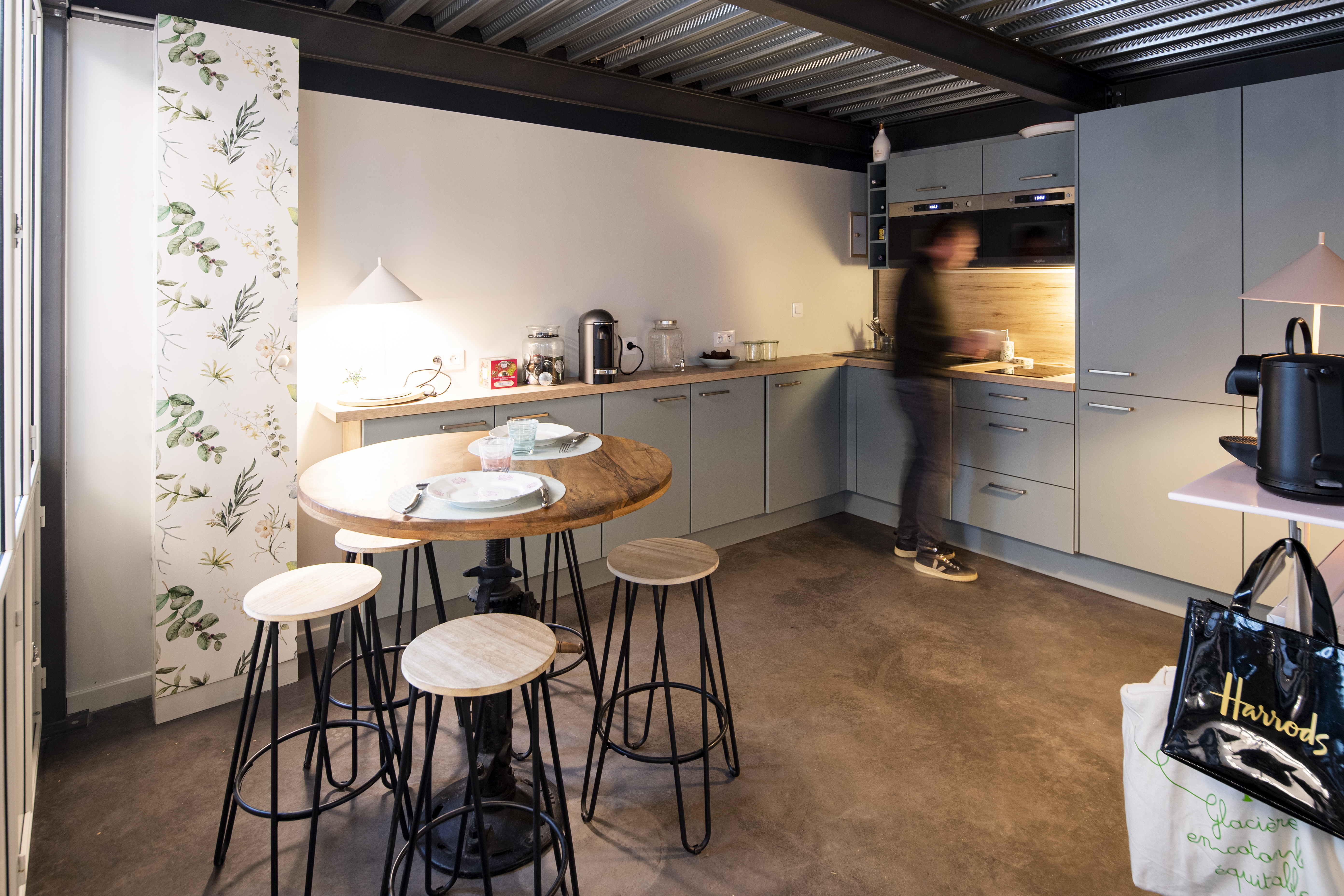 Comme dans la plupart des espaces tertiaires hyper urbains, la surface à disposition devait être optimisée pour répondre à tous les usages. La modularité n’est ici pas en reste, notamment grâce au choix mobilier : la cuisine semi-ouverte avec sa table haute offre la possibilité d’un rendez-vous à 2 ou 3 ; la salle de réunion à l’étage et son mobilier modulable se transforme en quelques minutes en salle de gym ; sans oublier la salle à manger avec sa table de métier ajustable en hauteur qui est idéale pour les déjeuners partagés, un rendez-vous ou encore un afterwork. Les bureaux à louer (ouverts ou fermés) sont parfaitement équipés et pensés pour s’adapter à l’utilisateur.