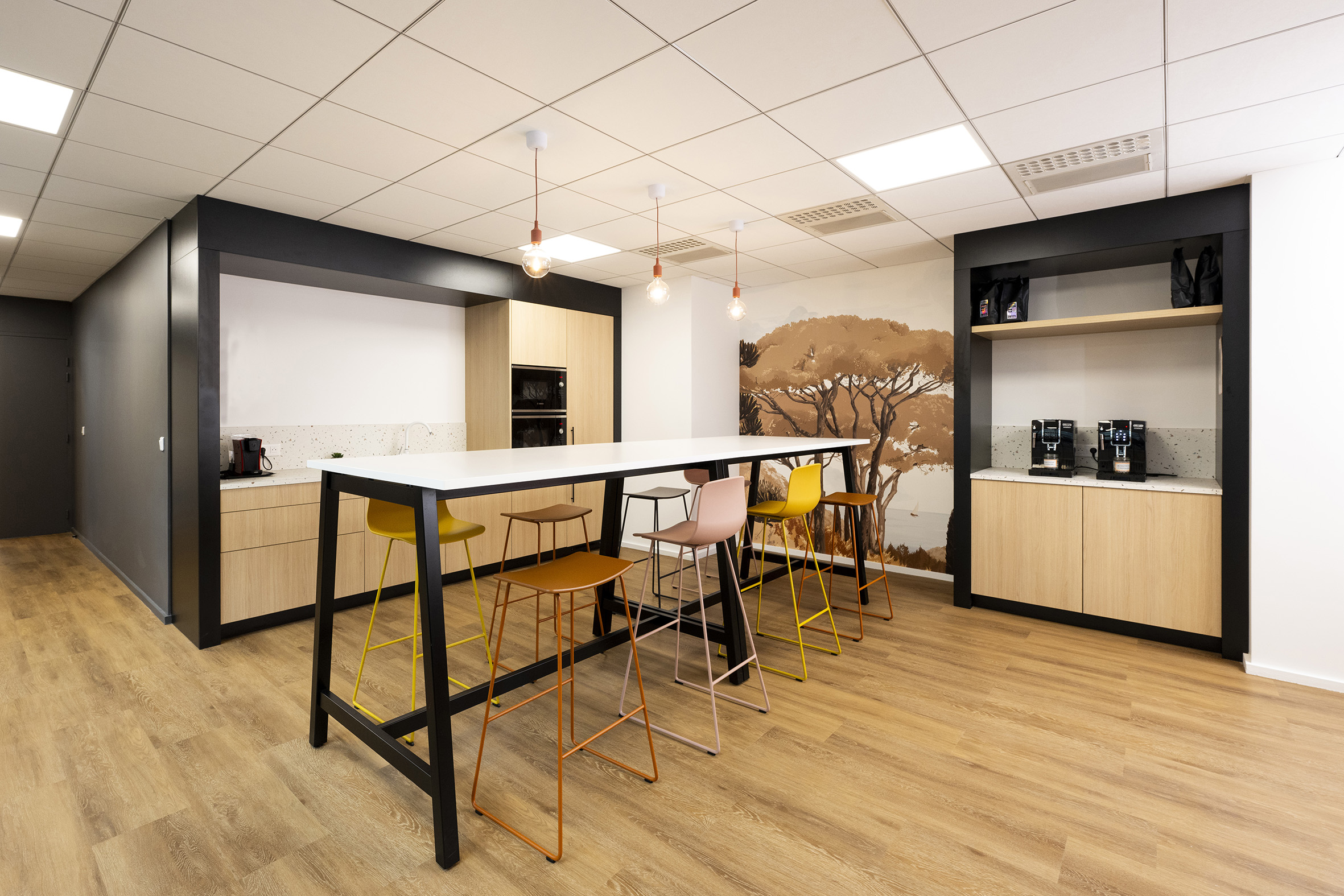 L’espace de convivialité a été bien agrandi et a été placé stratégiquement : il occupe désormais une place centrale au sein du service, devenant ainsi un véritable point de rencontre où les collaborateurs tissent des liens dans une atmosphère chaleureuse.