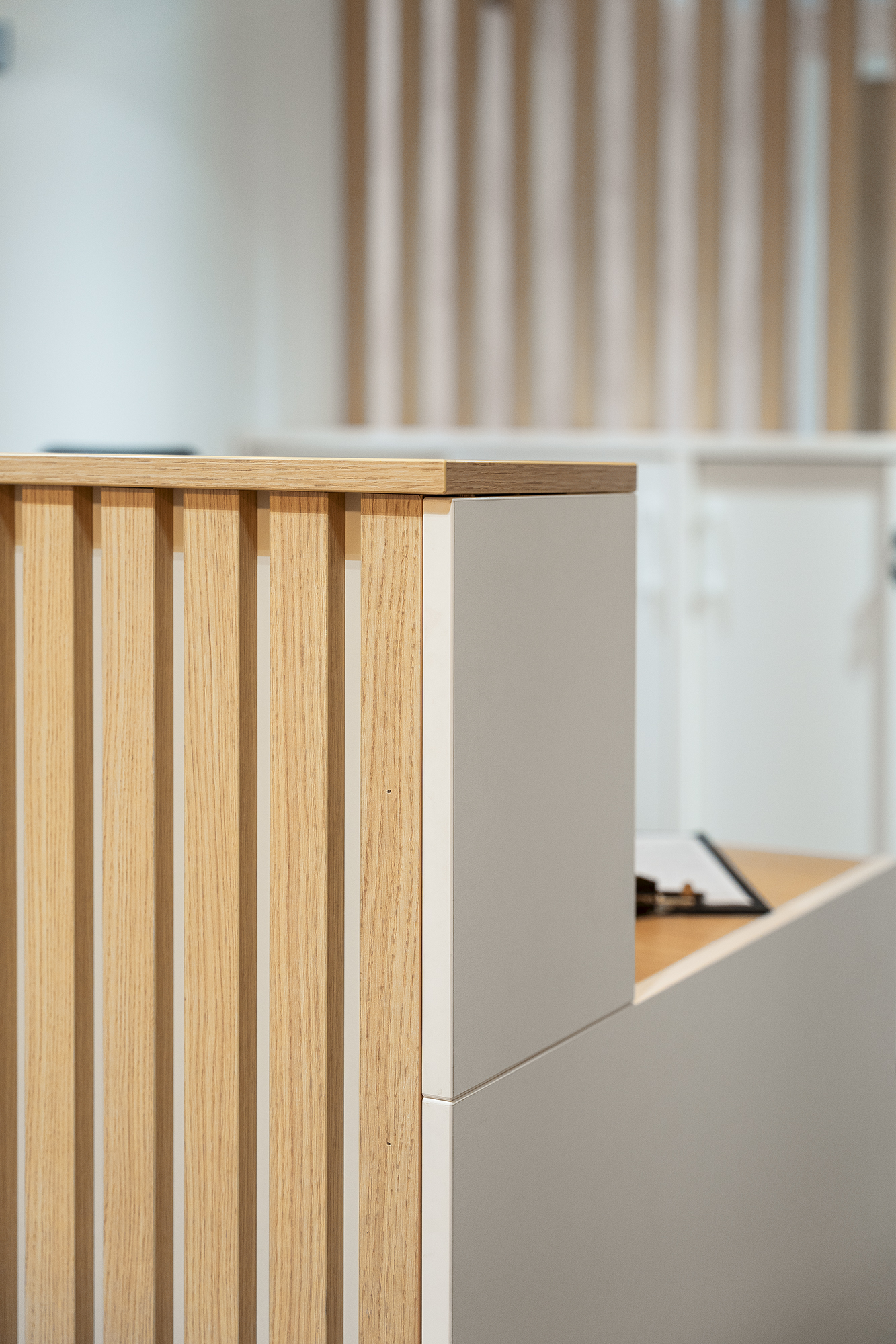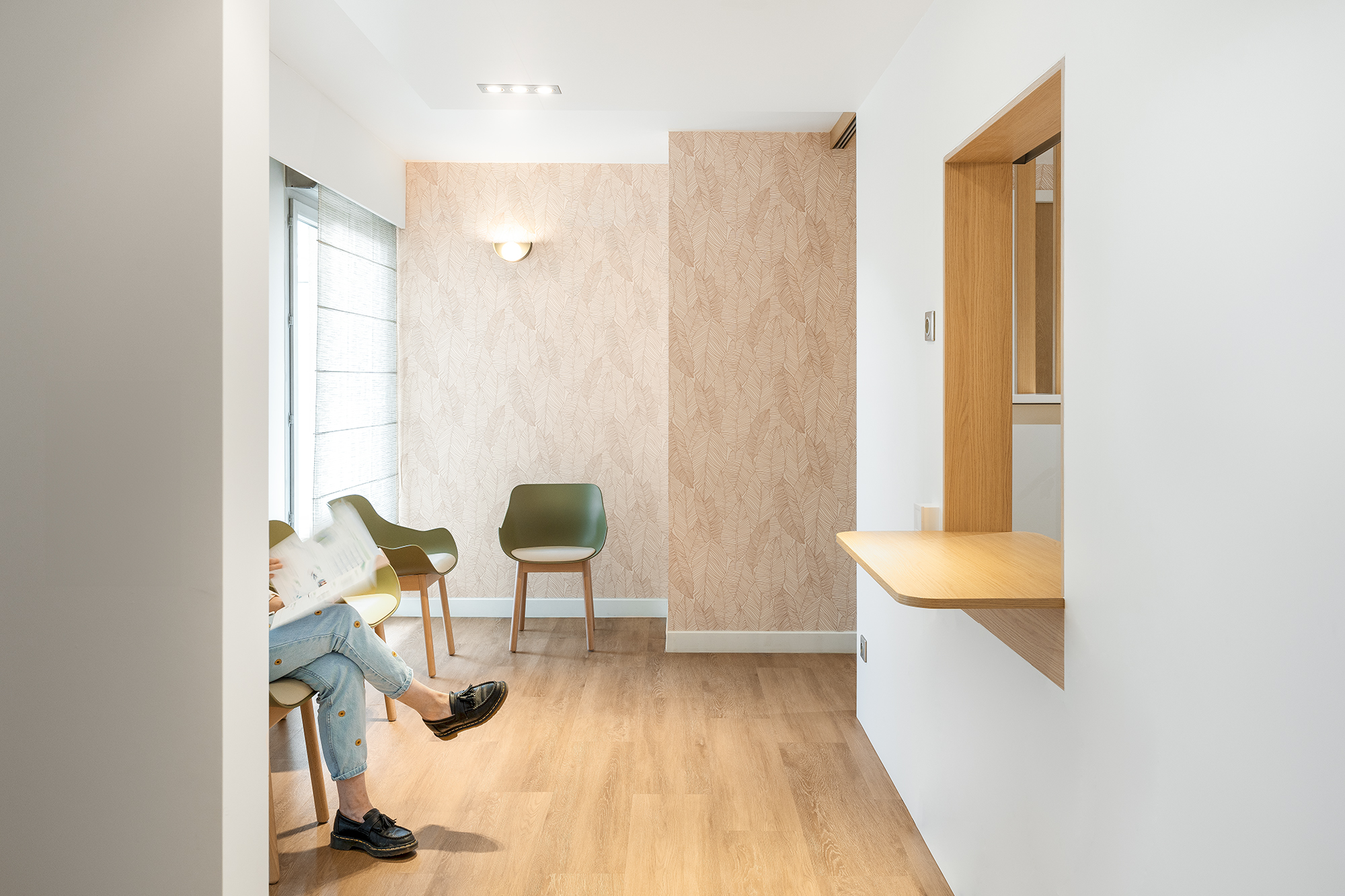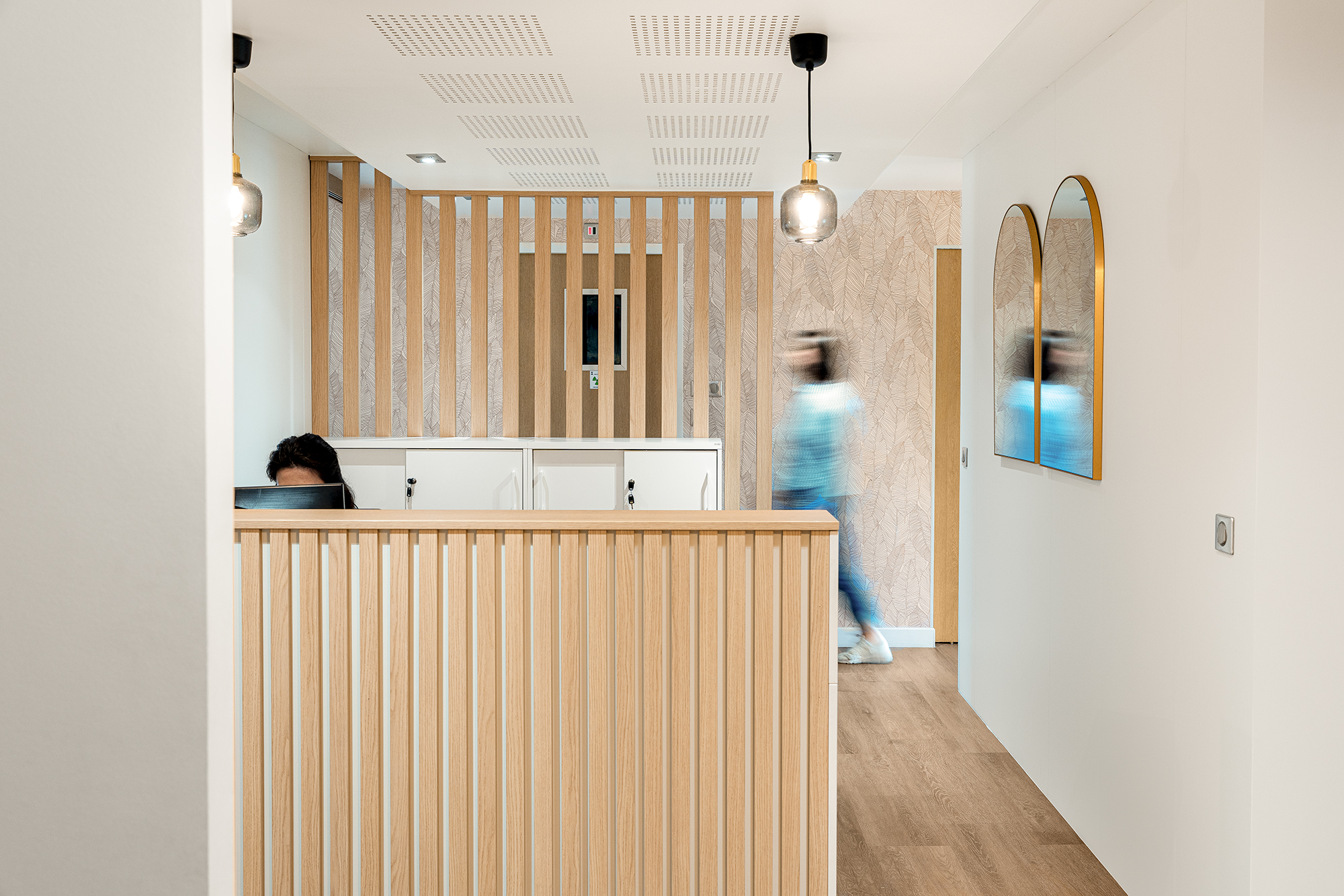 Le choix s’est donc porté sur des adhésifs à poser sur les agencements sur mesure existants. Ces adhésifs transforment l’atmosphère du lieu de façon bluffante : les agencements sont comme neufs, l’espace est lumineux et moderne, invitant les collaborateurs comme les patients à se sentir apaisés.