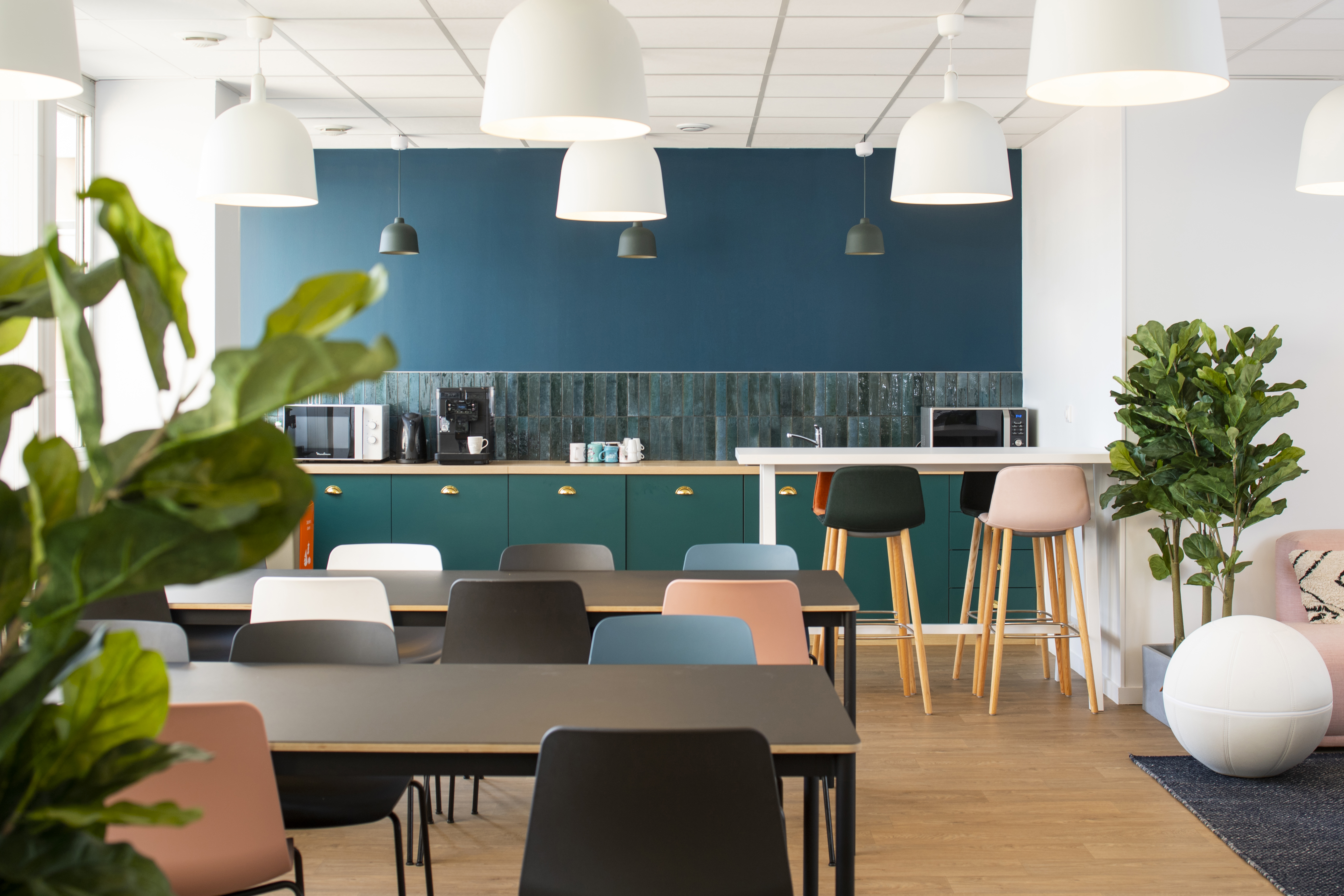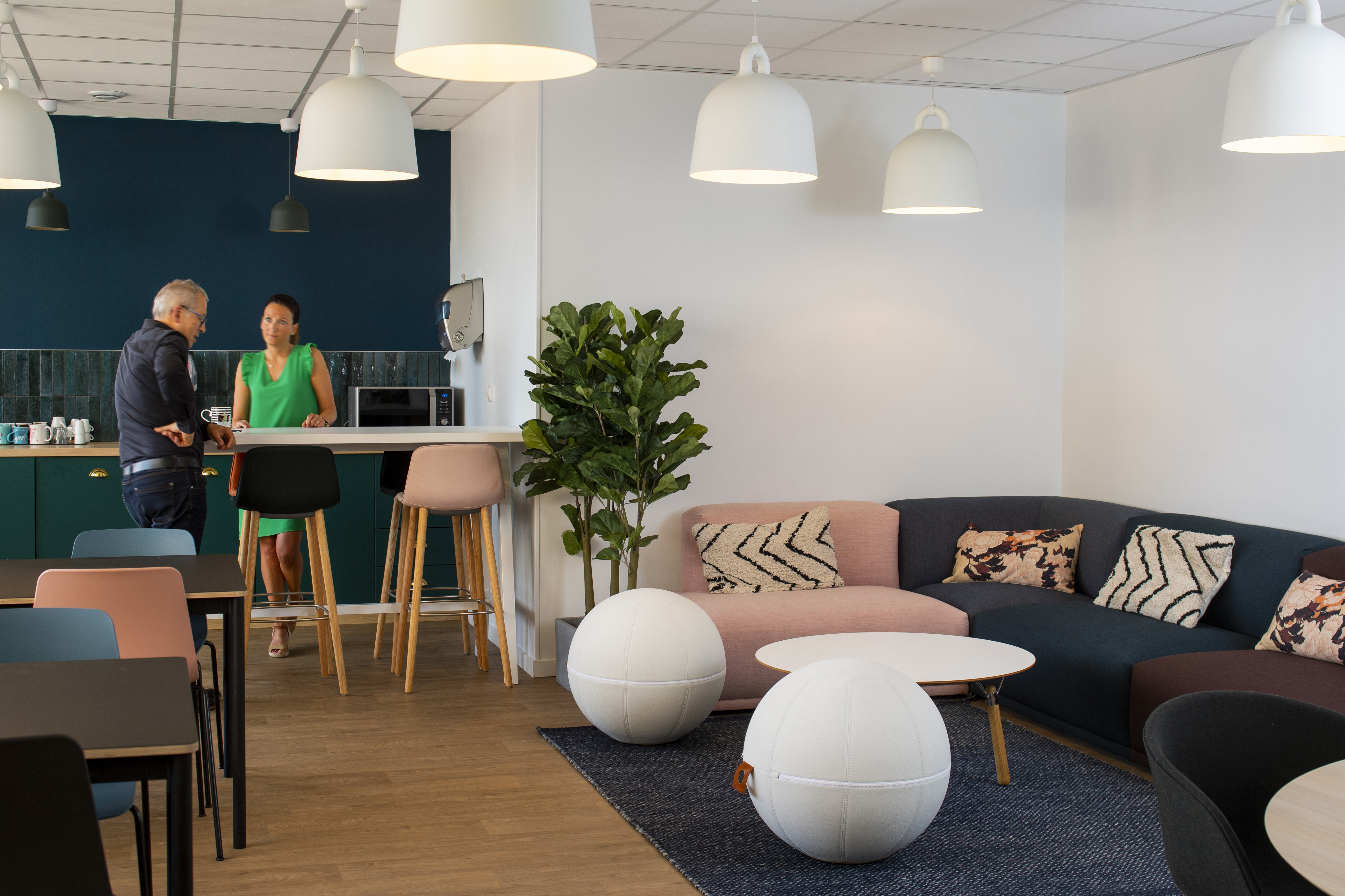 La salle de pause autrefois peu accueillante a été totalement repensée et agrandie. On peut tout à la fois s’y relaxer dans un espace lounge aux assises moelleuses, prendre un café sur le pouce sur la table haute, s’attabler correctement pour déguster son lunch, ou encore faire une petite sieste si besoin. Cet espace permet à la fois aux équipes de se retrouver et de se détendre dans un environnement chaleureux et convivial.