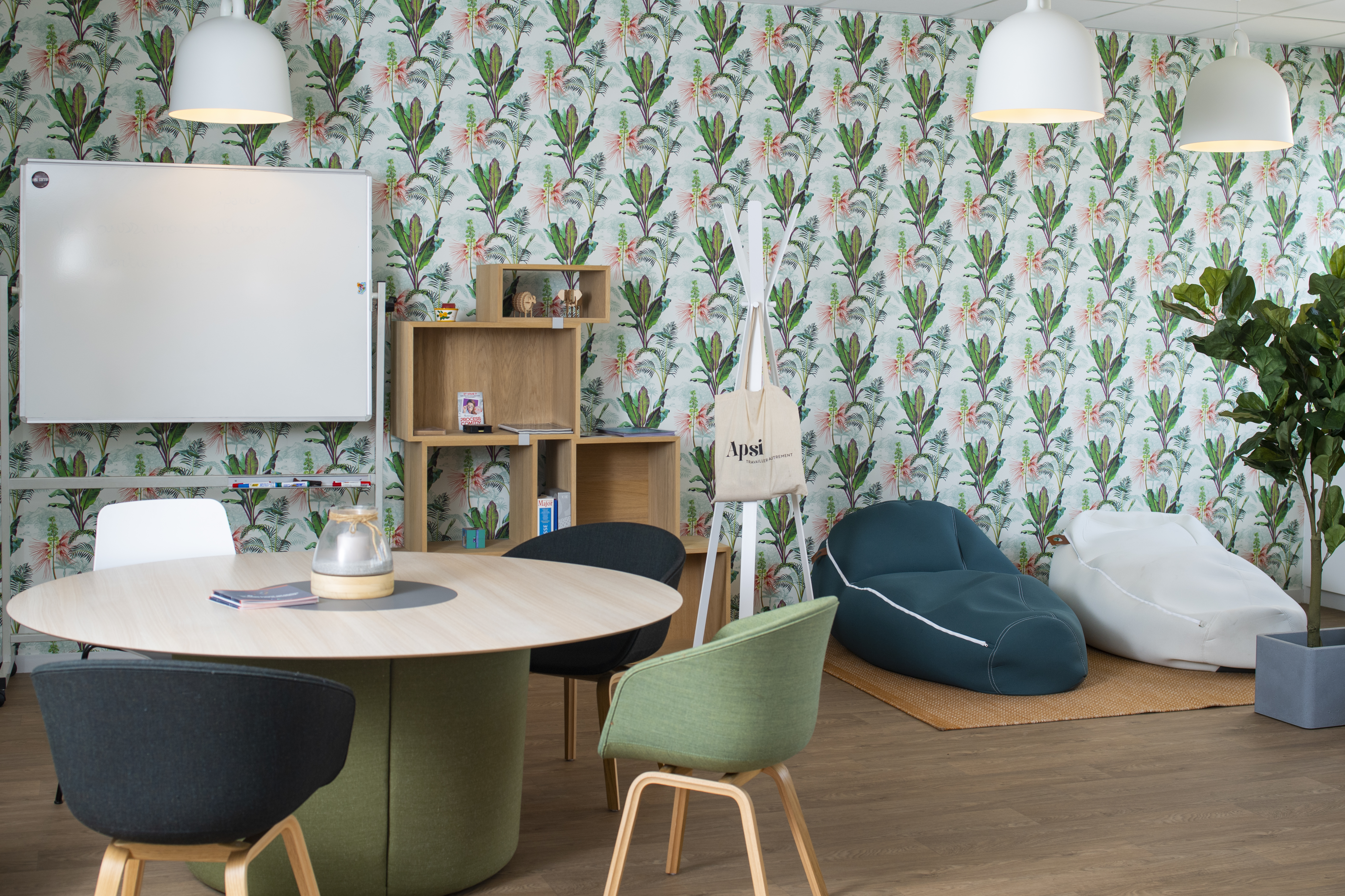 La salle de réunion, initialement classique et peu propice aux échanges naturels et bienveillants, est aujourd’hui plus dynamique et confortable. Des assises différentes et des mobiliers modulables permettent de réinventer sans cesse la façon de se réunir et d’échanger, facilitant la communication entre les équipes.