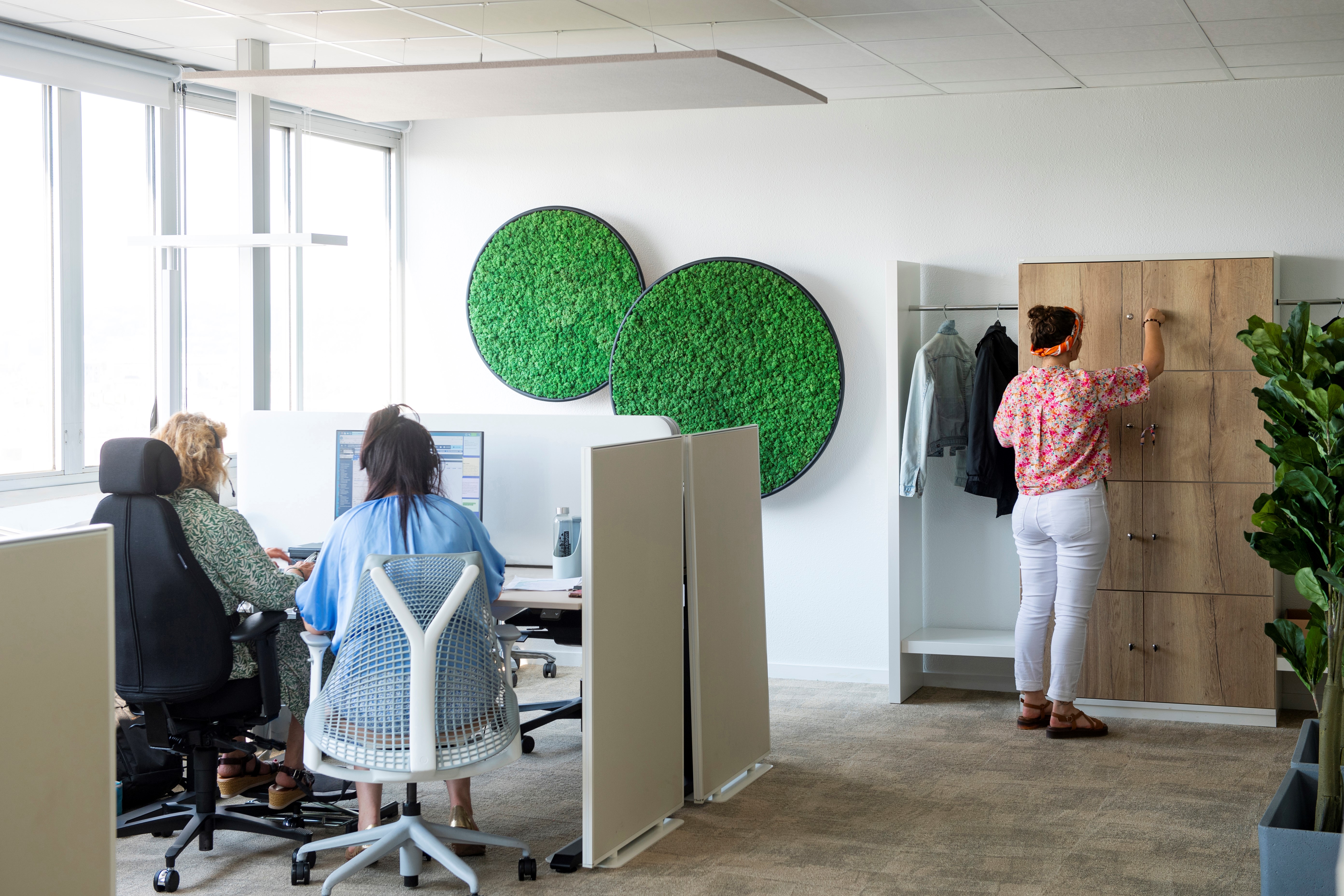 Pour apporter un confort visuel, un sentiment de bien-être et une certaine luminosité dans les espaces partagés, le concept esthétique imaginé par les architectes d’intérieur Apsi puise son inspiration dans la nature et le hygge. Les couleurs neutres et claires sont relevées par le vert intense des plantes stabilisés et des accents de chêne massif et chaleureux sur les casiers. La salle de pause et la salle de réunion suivent le même concept biophilique grâce aux tons verts, aux papier-peints, aux éléments en bois et aux plantes.