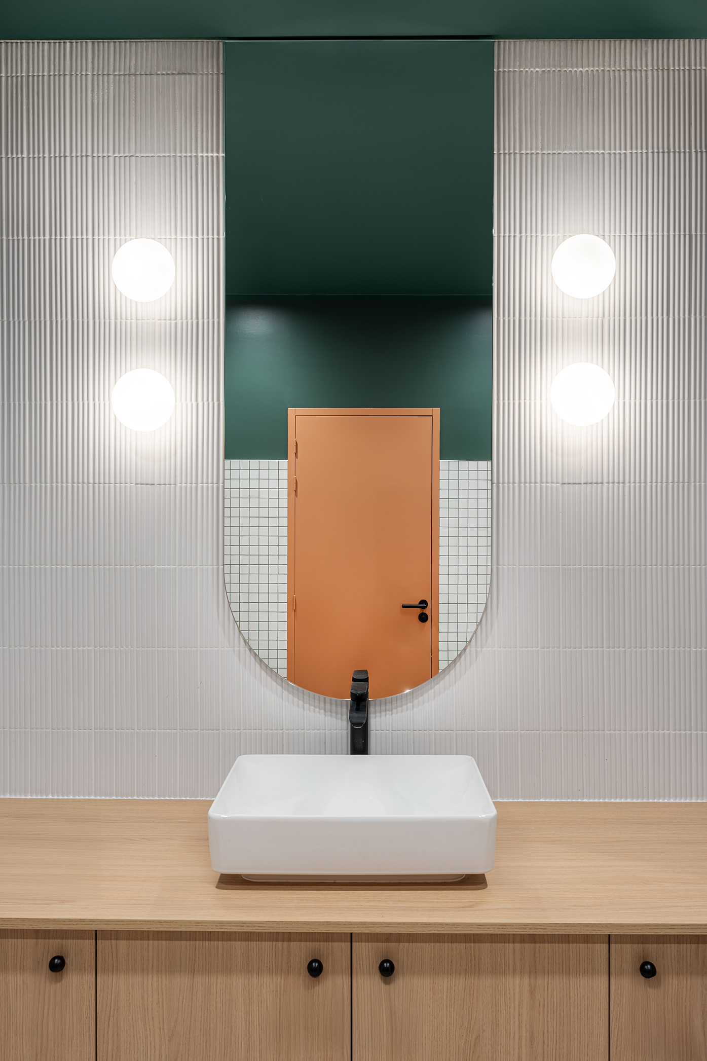 Les détails comme les poignées, luminaires, papiers peints et la signalétique ont été sélectionnés avec soin, s’harmonisant parfaitement avec l’esthétique globale du projet. Les parois en verre ont également été revêtues d’un film dépoli, en dégradé subtil, pour garantir la confidentialité tout en respectant la luminosité et l’élégance des lieux.