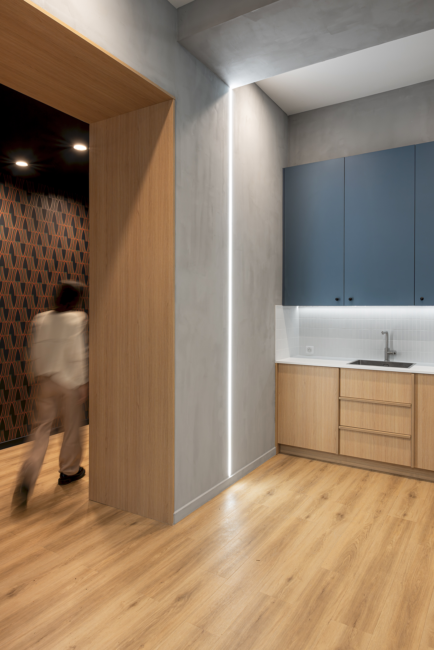 Apsi a imaginé un aménagement intégral en pensant chaque détail pour créer un espace raffiné et fonctionnel. Les travaux menés par Relief ont inclus : la cuisine, les sanitaires, un espace reprographie, un dressing d’entrée astucieux entre autres rangements sur mesure.