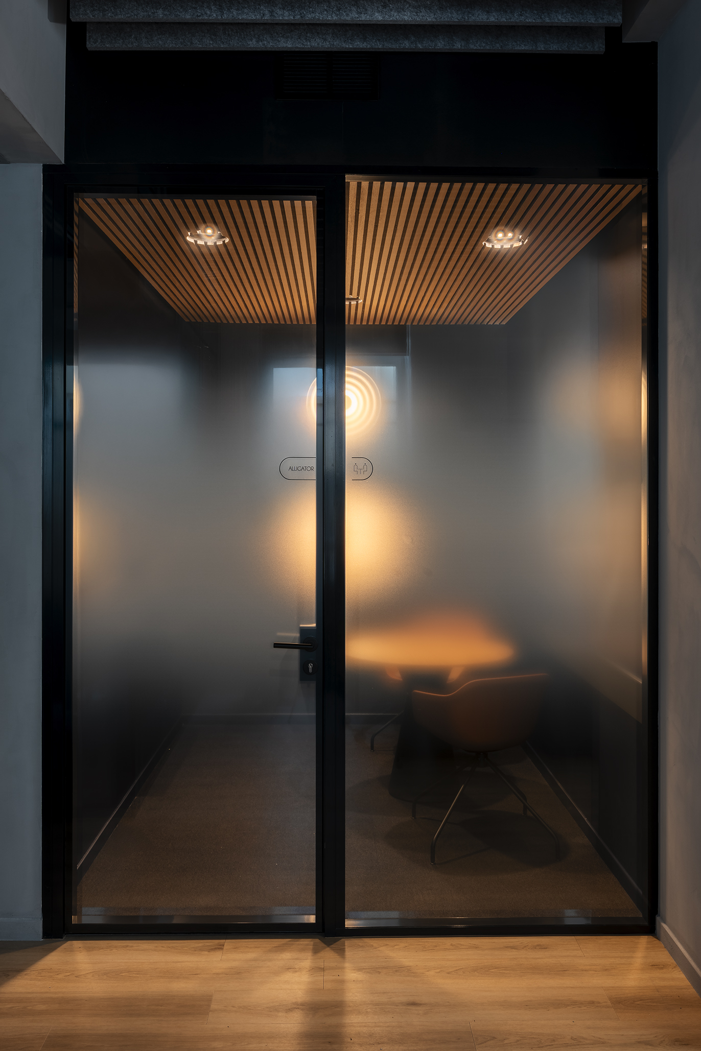 • Plafonds en tasseaux de bois avec feutrine acoustique dans l’espace visioconférence.