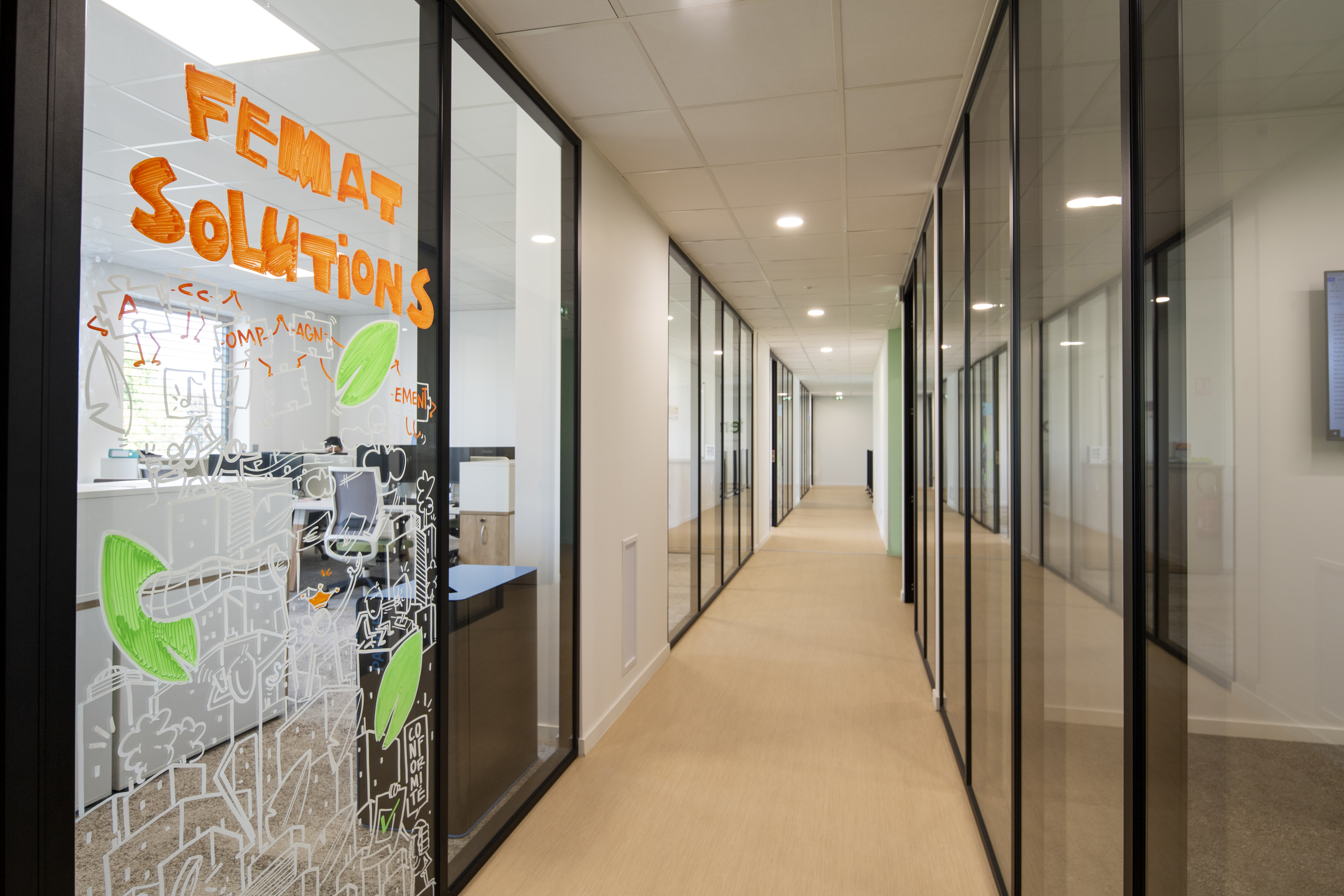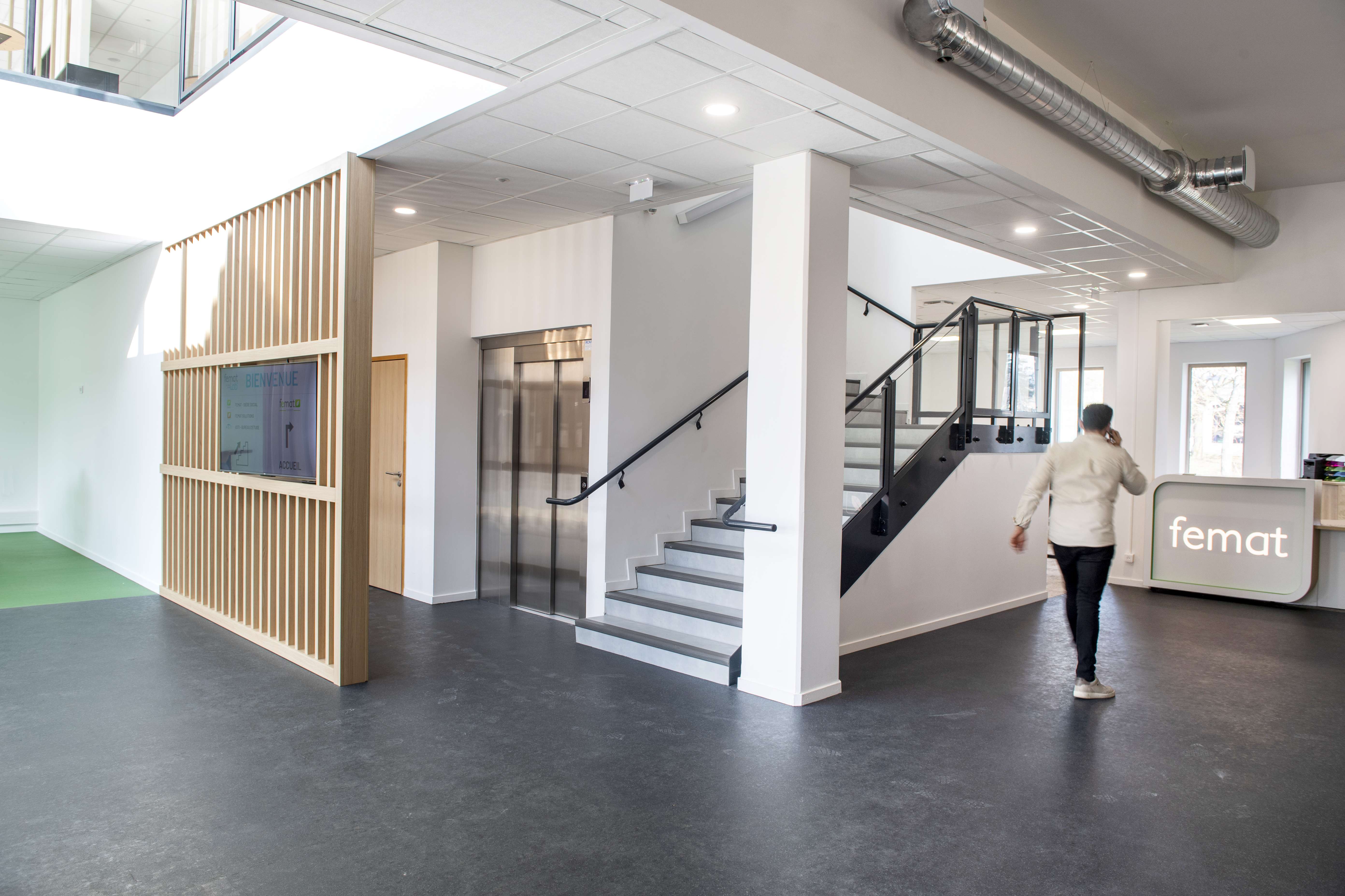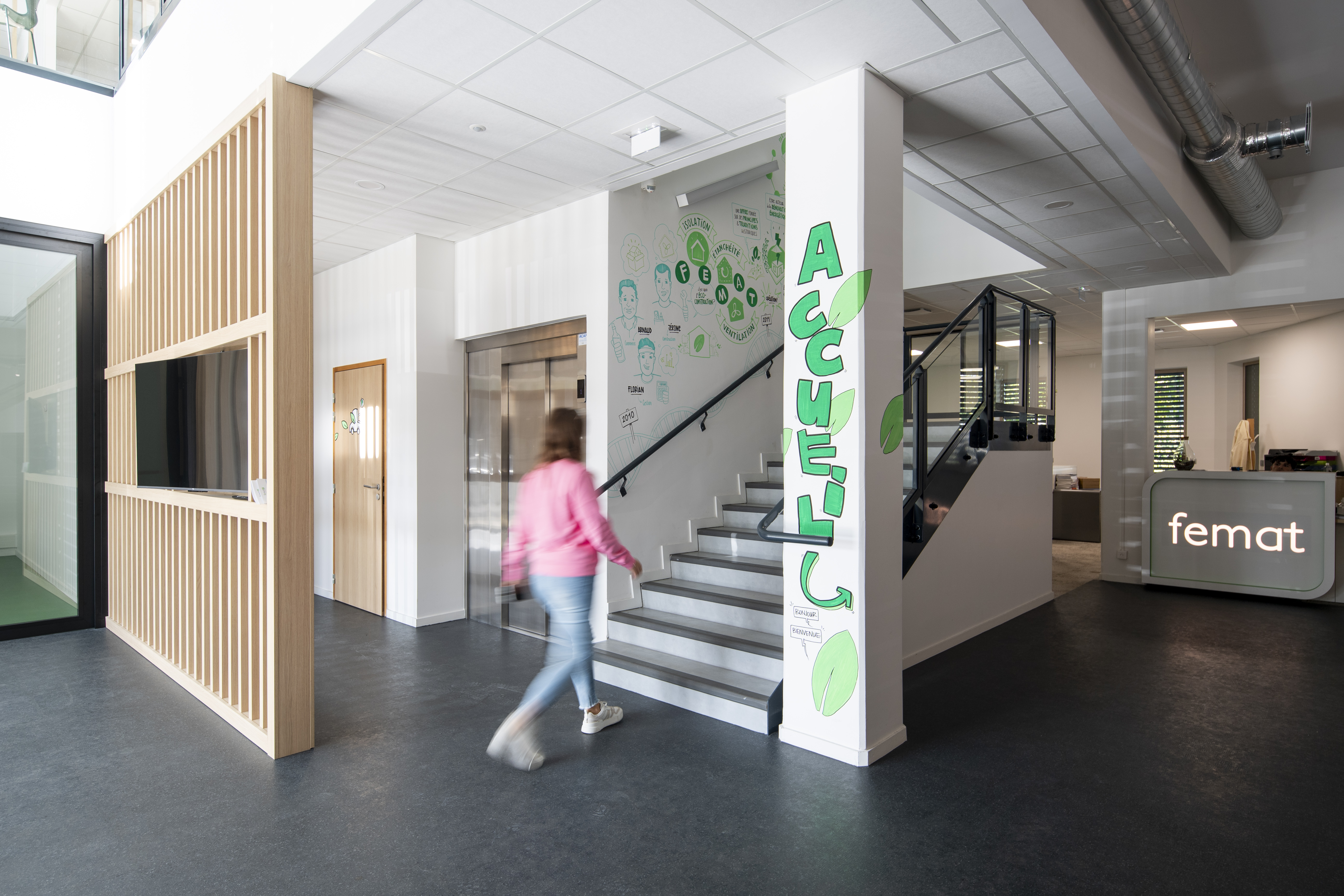 Le concept esthétique basé sur l’identité visuelle et les valeurs de FEMAT se traduit par une ambiance chaleureuse et naturelle, où la biophilie et le vert sont à l’honneur. On retrouve notamment cette couleur dans les fresques murales qui expliquent l’histoire de FEMAT et ses solutions et qui habillent par la même occasion les murs des escaliers et des couloirs, guidant collaborateurs et clients à travers les locaux.