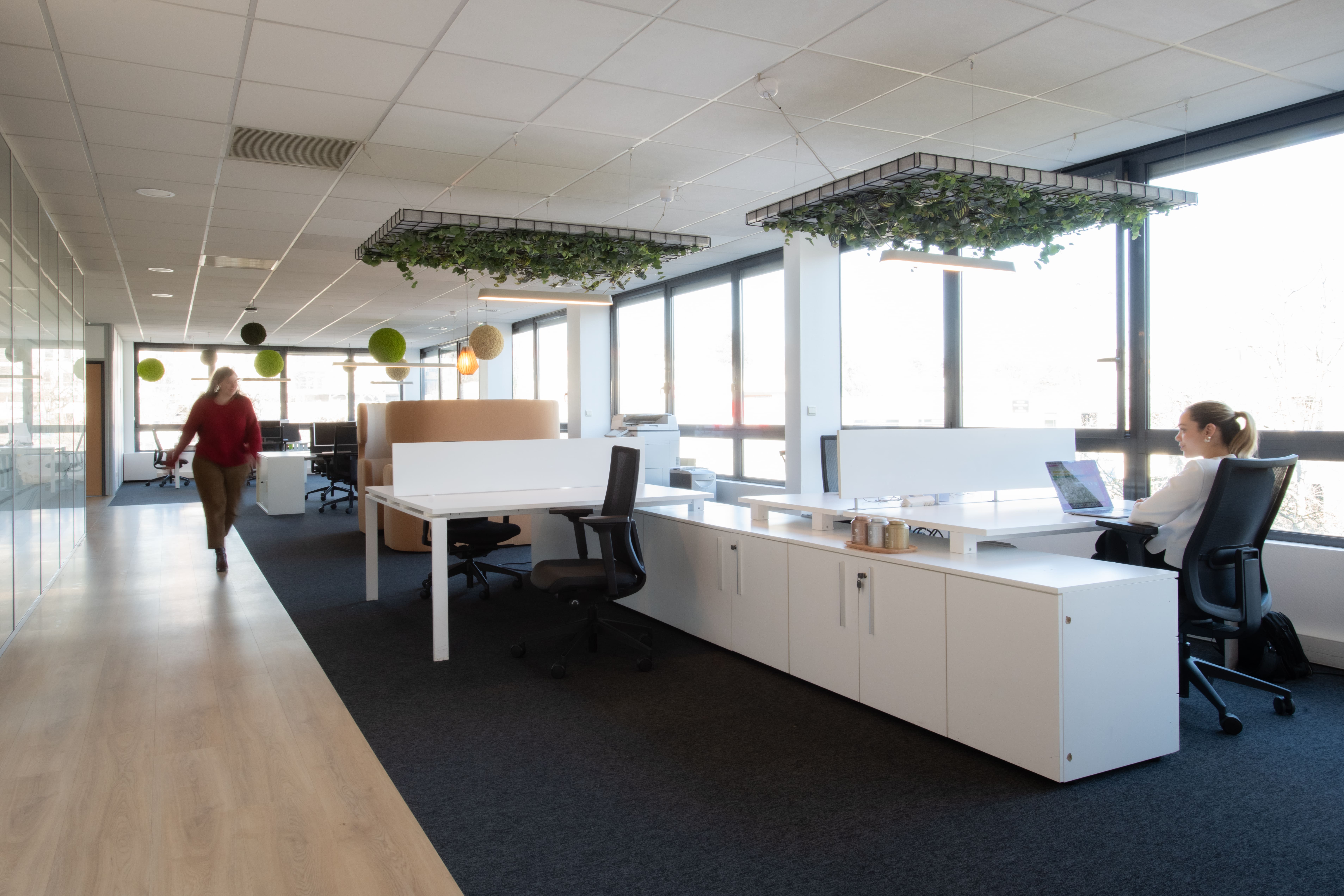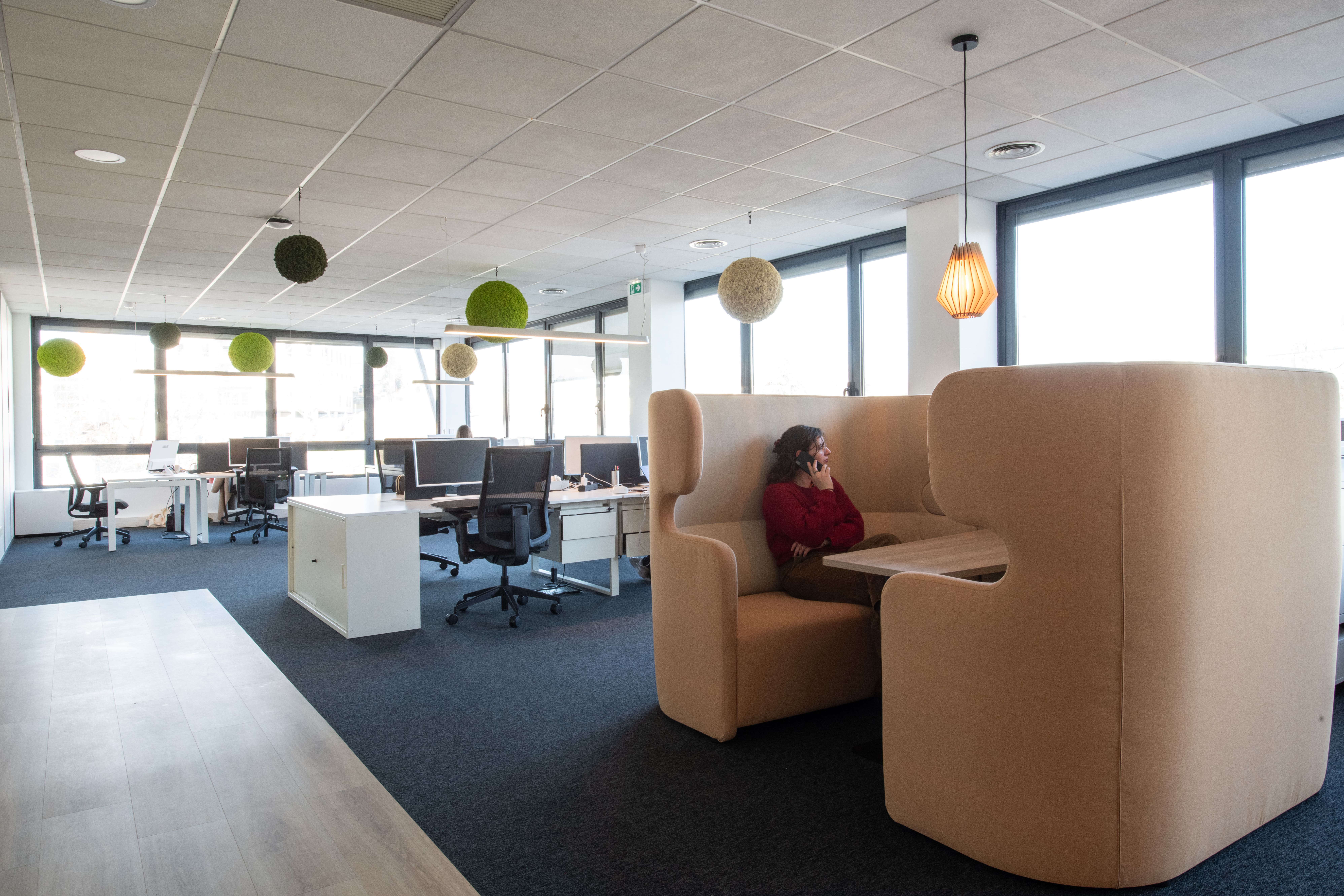 À l’étage, les espaces ouverts accueillent les collaborateurs pour leurs tâches quotidiennes. Ponctués d’espaces collaboratifs plus ou moins (in)formels et de zones de concentration et de confidentialité, ils répondent aux besoins de chacun. Afin de gérer l’acoustique des deux open-spaces, l’équipe d’Apsi a prévu des suspensions acoustiques végétales. Ces touches vertes et naturelles remplissent en réalité deux autres rôles : créer des espaces de travail biophiliques, la biophilie étant reconnue pour impacter positivement le bien-être et la productivité des collaborateurs, et faire un clin d’œil subtil à l’identité et aux valeurs d’EVS, en rappelant le vert doux de sa charte graphique et l’idée de durabilité que les plantes suscitent.