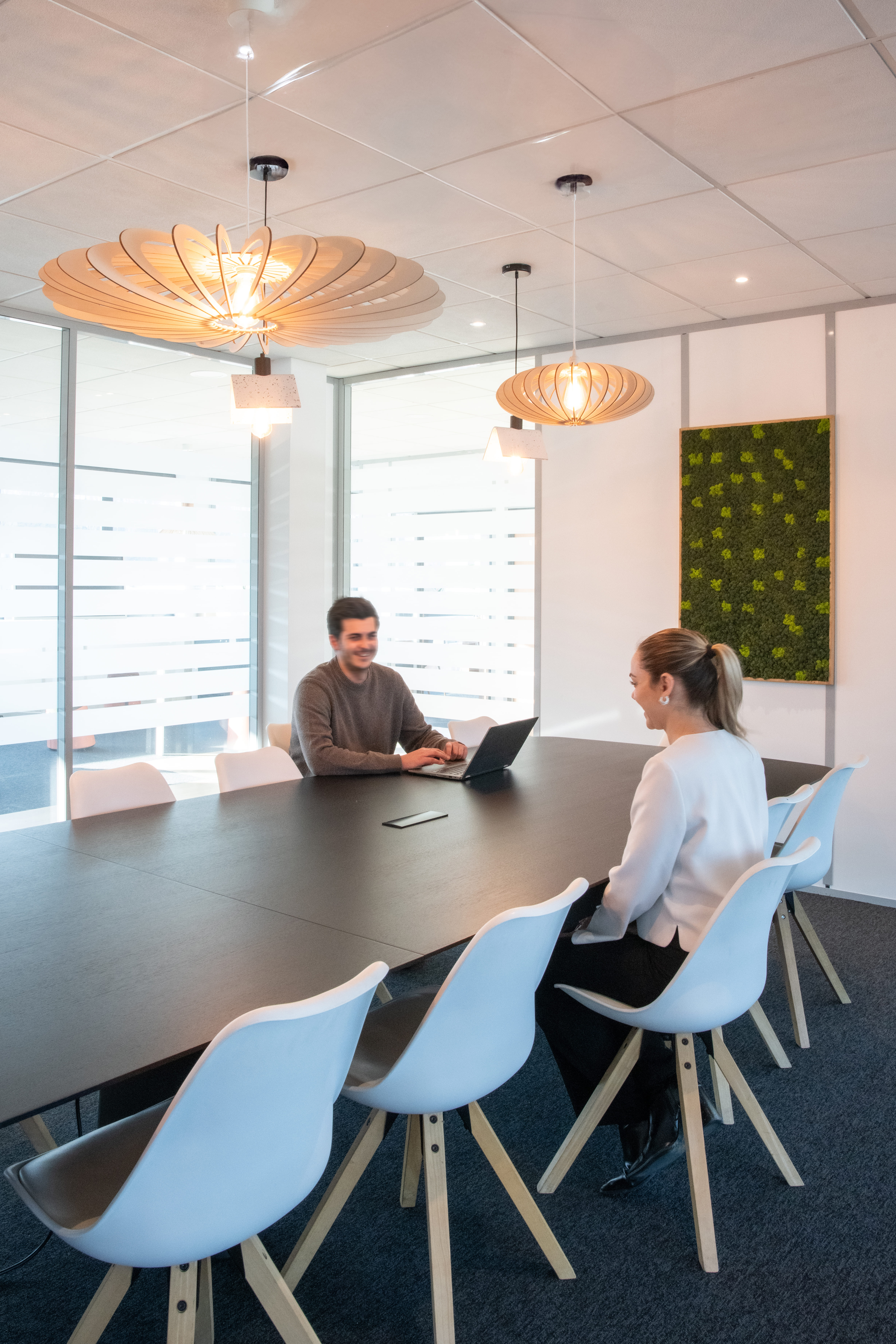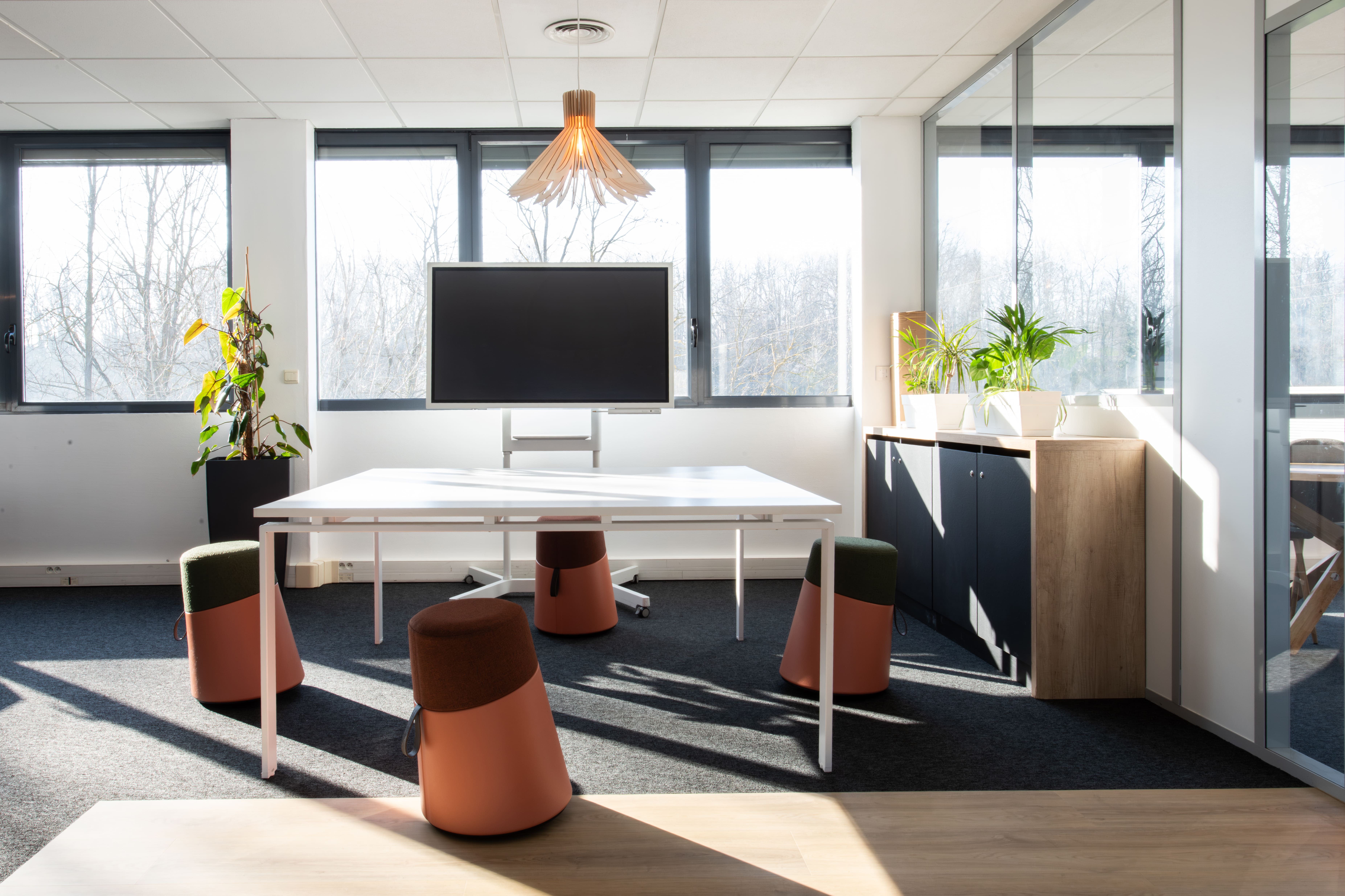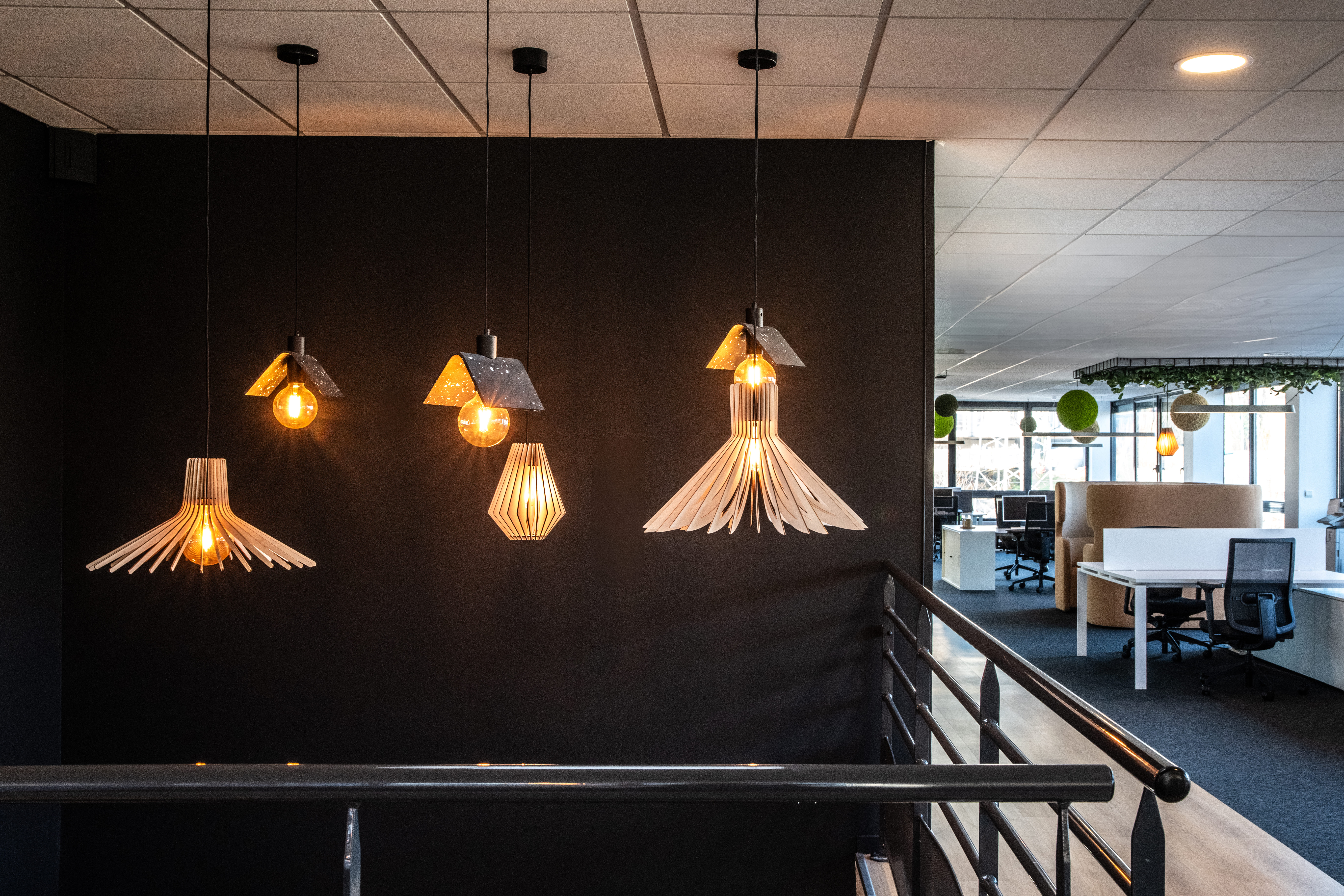 Enfin, tel un fil conducteur, dans tous les espaces, du rez-de-chaussée au premier étage, on retrouve les mêmes suspensions en bois et en plastique recyclé : là encore, on joue à la fois sur la biophilie et le réemploi pour mettre en avant les forts engagements RSE d’EVS.