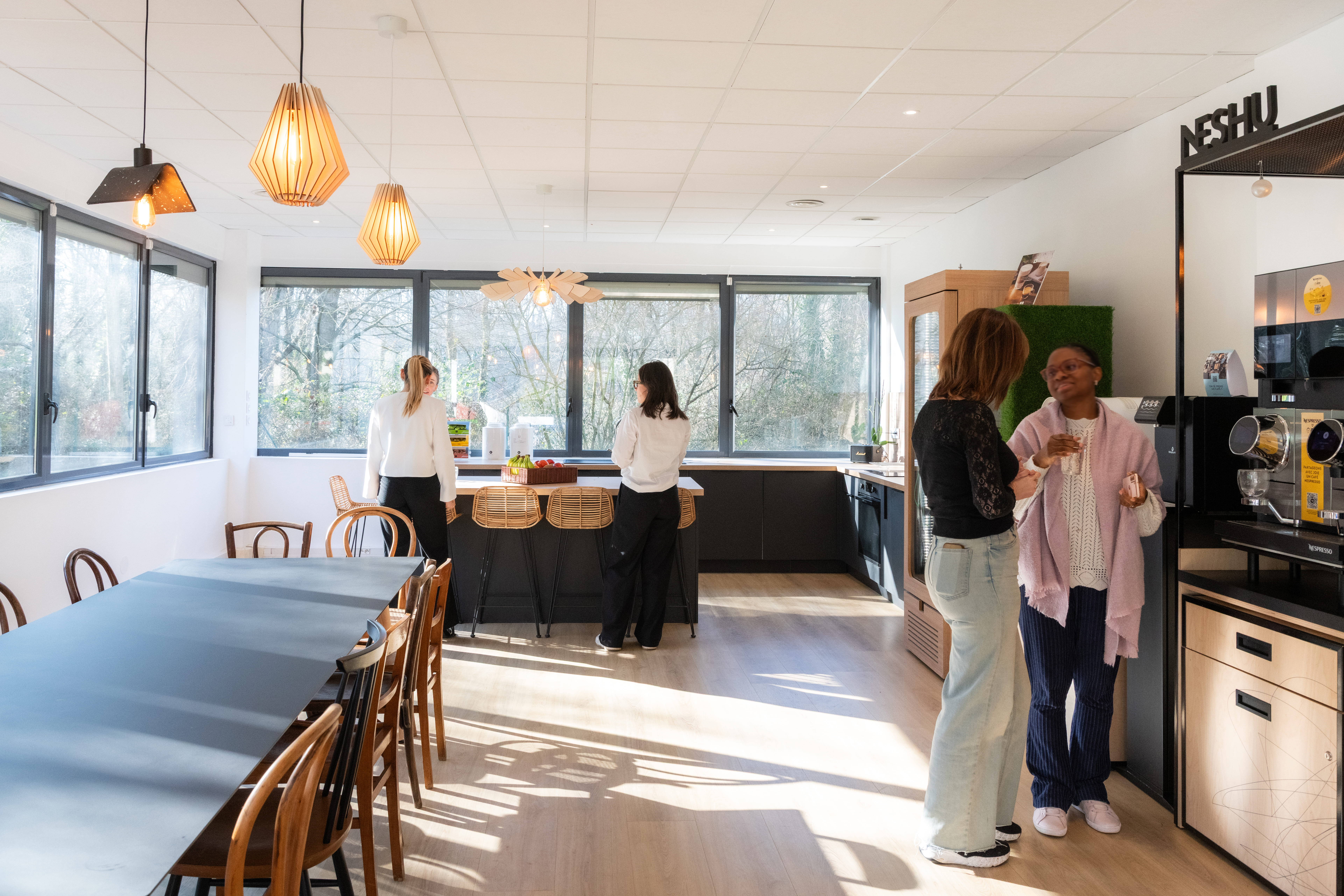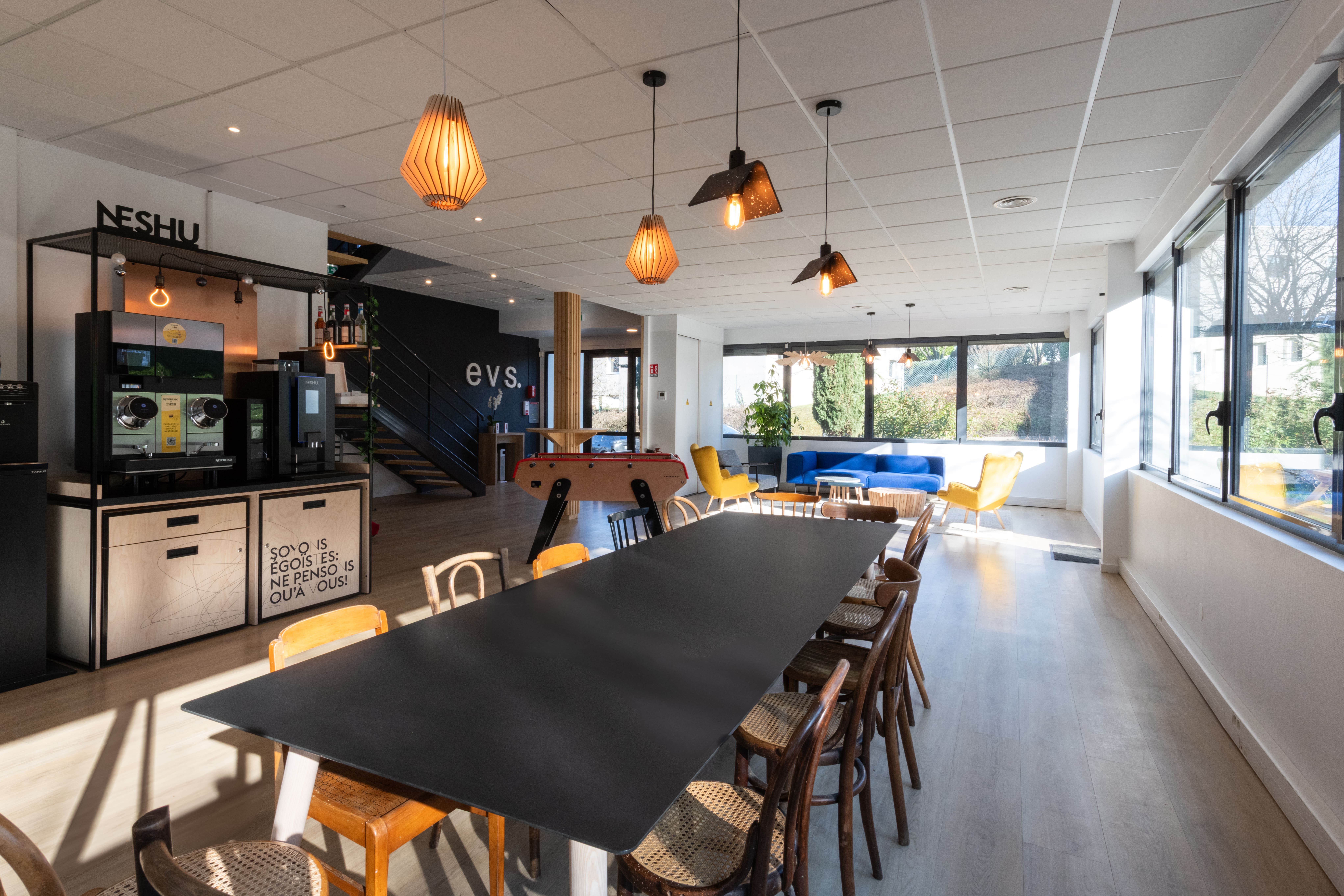 Dès que l’on entre dans les nouveaux locaux d’EVS, on découvre un grand espace de convivialité qui invite à se retrouver autour d’un café, à se détendre dans le canapé ou encore à partager un moment entre collègues, tout simplement. Ce véritable lieu de vie met en avant le savoir-faire et les valeurs d’EVS : créer des moments de partage et de convivialité, rassembler les collaborateurs autour d’un café ou d’un jus de fruit, durablement – dans tous les sens du terme.