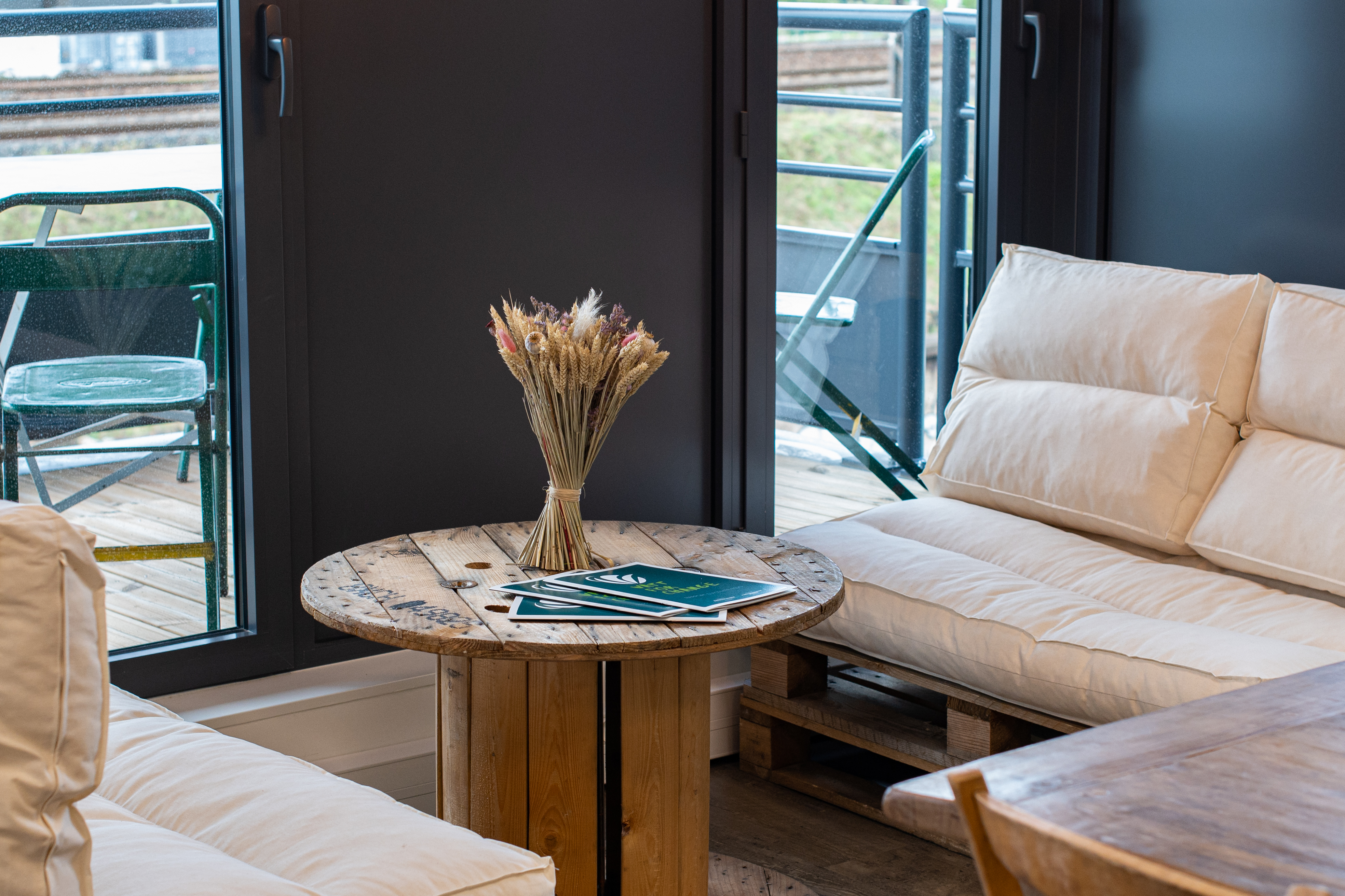 Déjeuners ou cafés se partagent « comme à la maison » dans la chaleureuse cuisine sur l’une des grandes tables de ferme et ses bancs assortis ou sur un mange-debout réalisé à partir d’un touret ou encore lové dans les canapés upcyclés en palettes… l’architecte d’intérieur a poussé l’idée jusque sur la terrasse avec du mobilier en métal de seconde main. Cet esprit broc se marie parfaitement au reste du mobilier et à la nécessaire digitalisation des espaces : pour preuve, l’imprimante connectée repose fièrement sur une ravissante commode années 50.